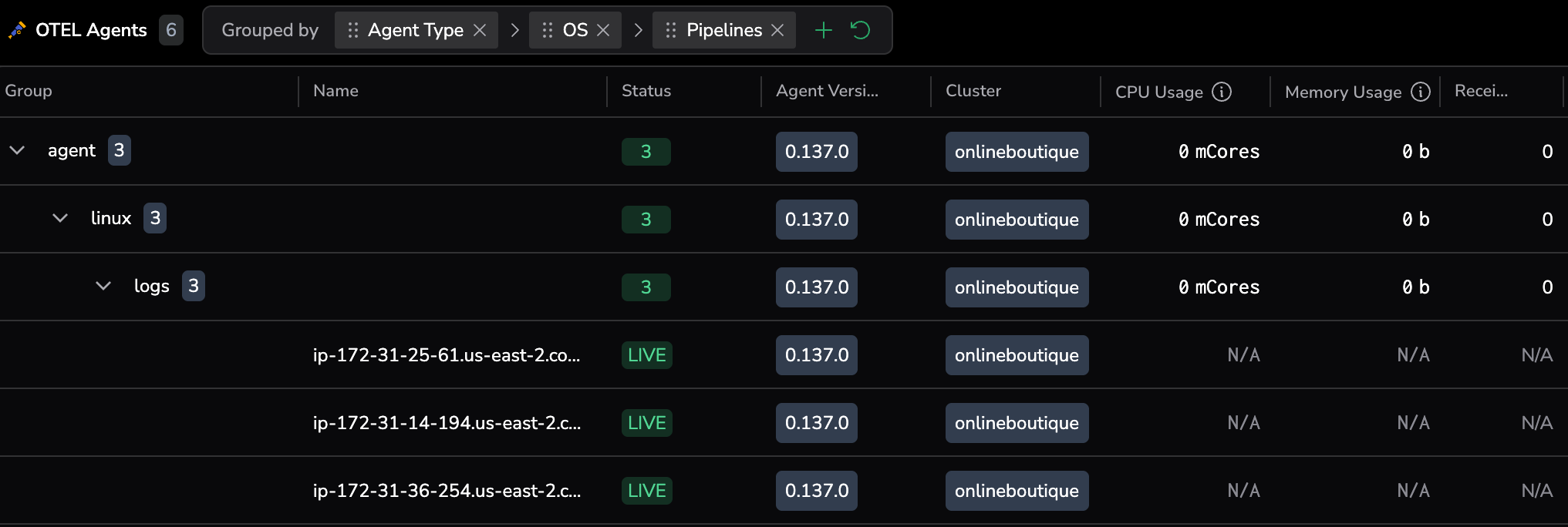 | Pipelines | The telemetry pipelines configured for the agent, such as logs, metrics, traces or profiles. |