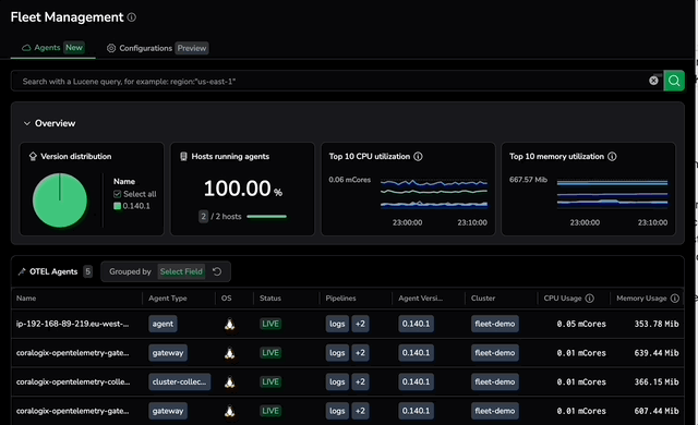 - Overview - Live status, CPU and memory usage, and receiver or exporter errors.