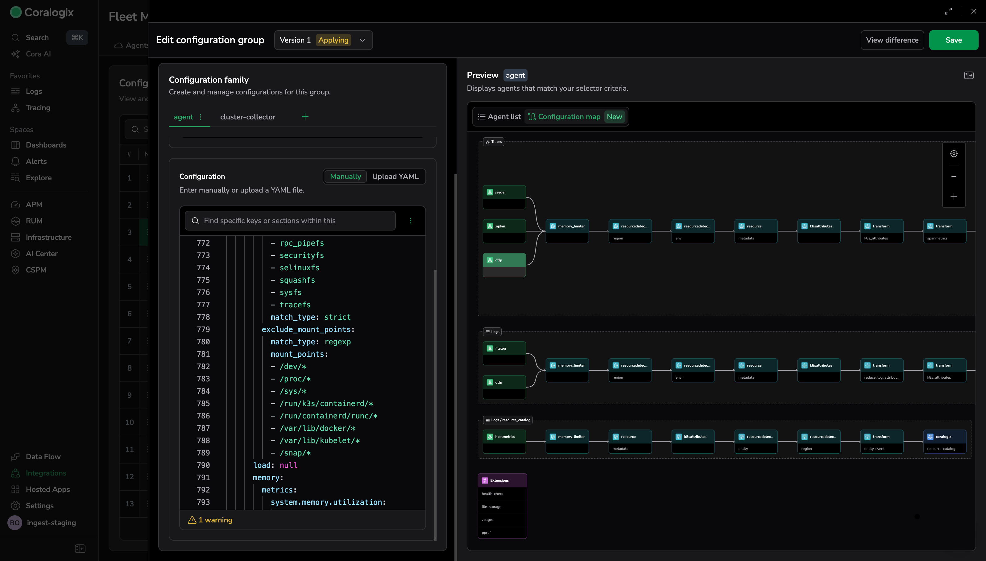 Config Navigator provides a real-time, interactive visualization of your OpenTelemetry (OTel) Collector configurations. This feature transforms complex YAML definitions into a transparent architectural map, allowing you to validate data flow, verify processing logic, and understand the precise relationship between pipeline components.