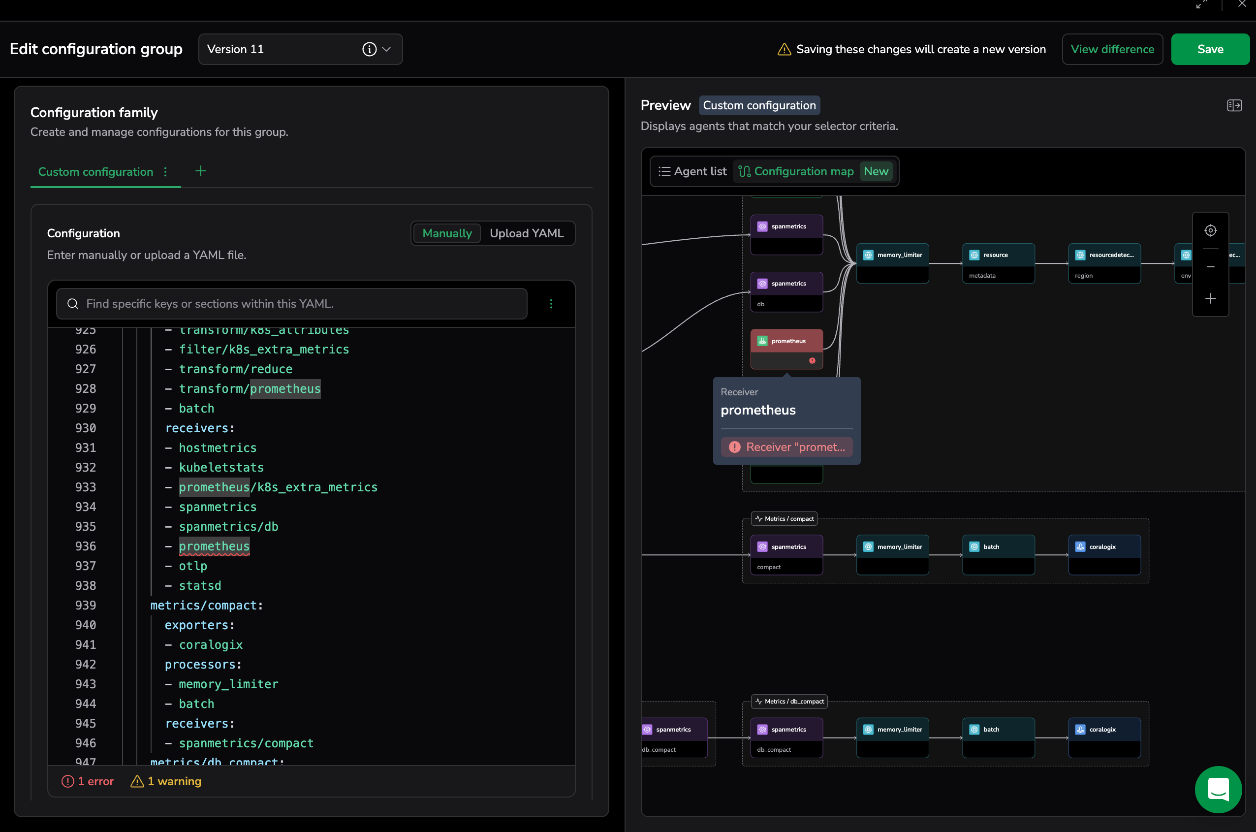 Config Navigator validates your configuration in real time and highlights issues directly in the map and YAML editor.