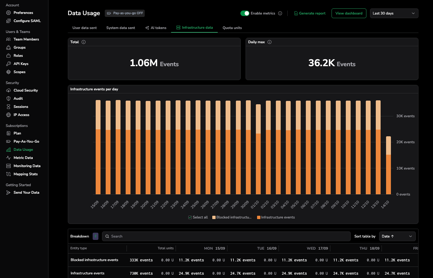The Infrastructure Data tab in the Data Usage section offers a clear breakdown of ingested infrastructure events and any that were blocked due to filters or limits.