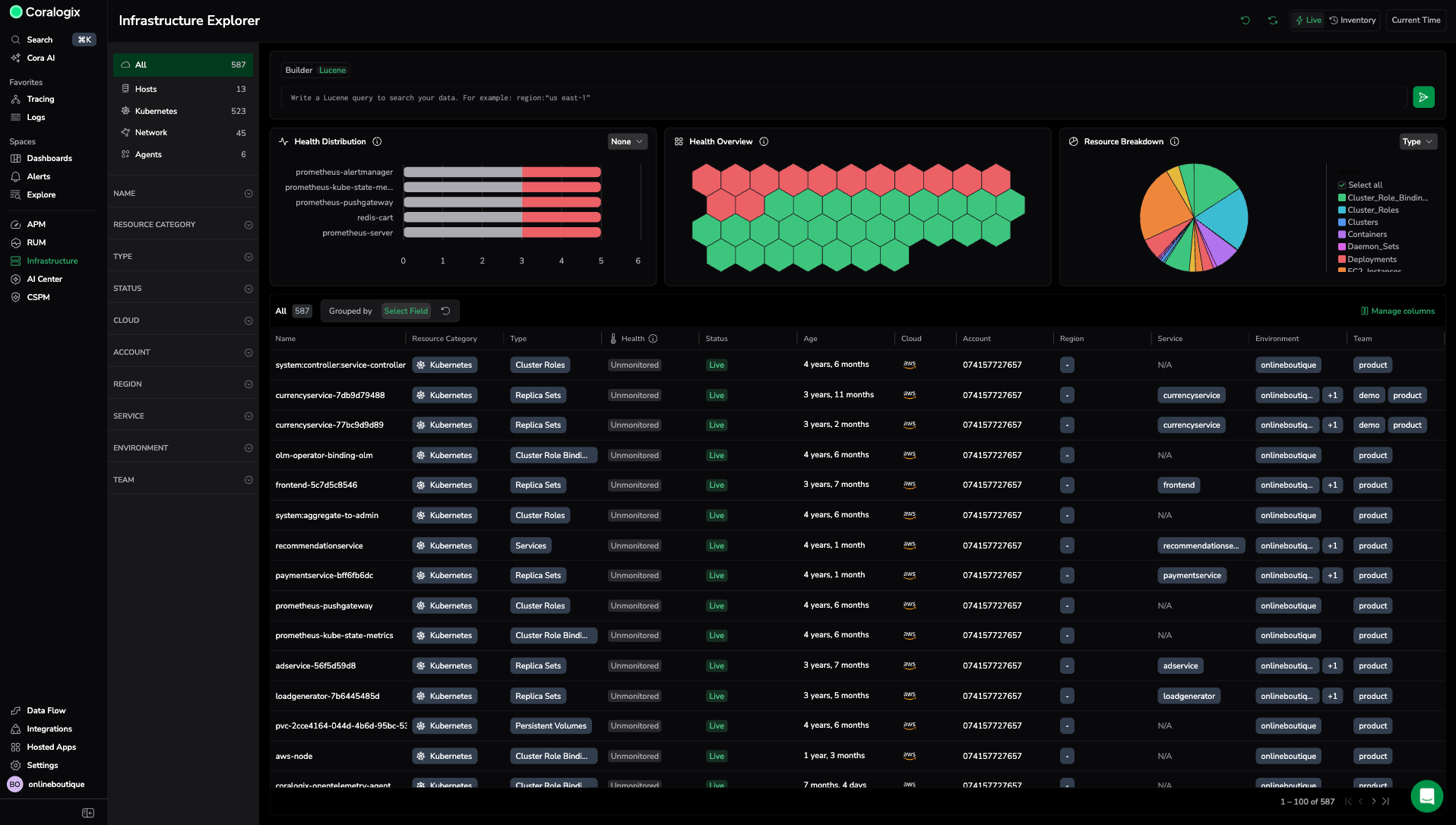 Filter infrastructure resources using a guided, no-code interface or write Lucene queries directly. The search bar in Infrastructure Explorer supports two modes: Builder for structured, chip-based filtering and Lucene for raw query syntax. Switch between modes depending on your workflow.