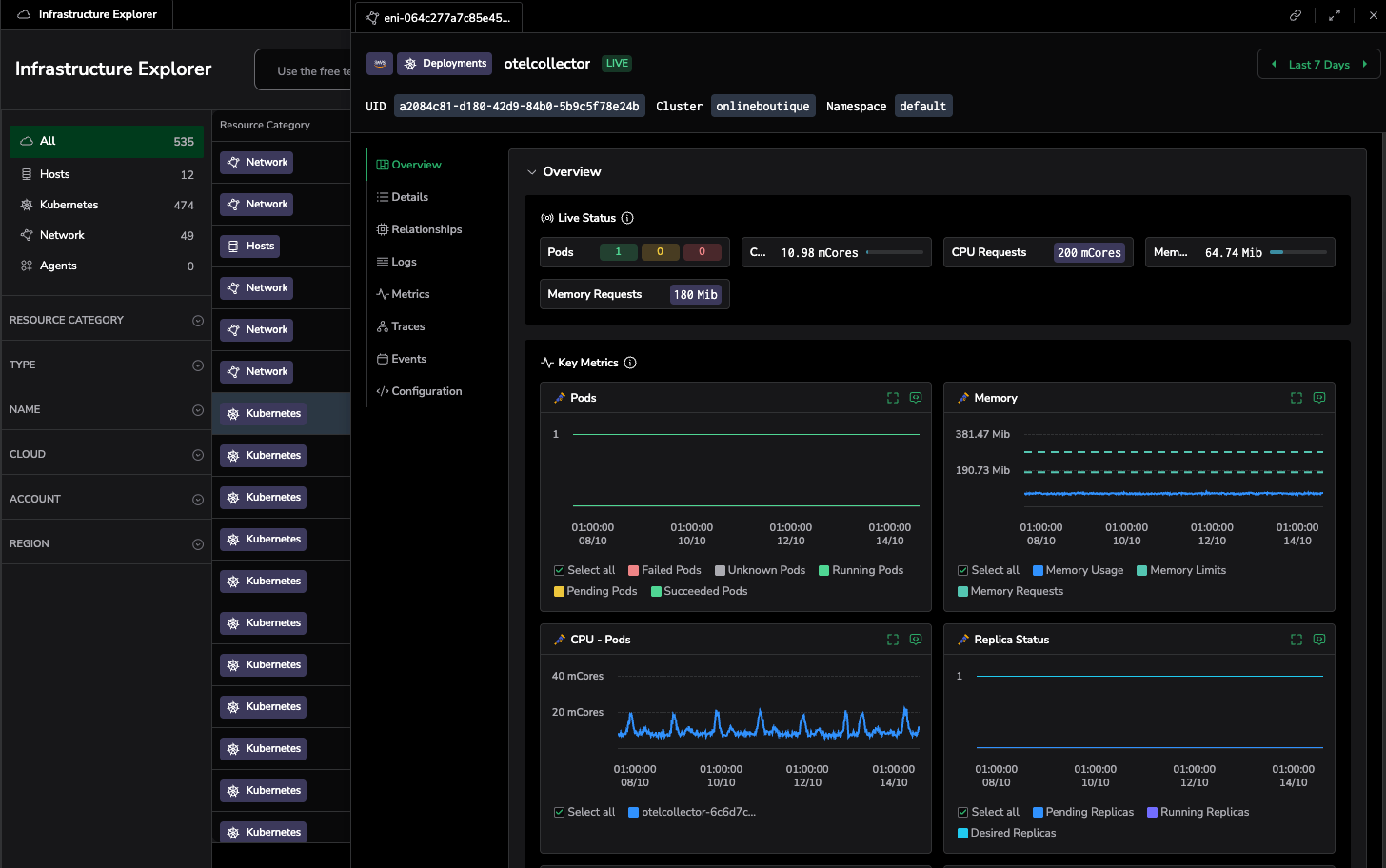 The Infrastructure Explorer provides a unified view of your infrastructure across Kubernetes and cloud environments. It surfaces context-rich metadata for each resource including clusters, nodes, pods, containers, hosts, network interfaces, and more, making it easy to navigate complex systems.
