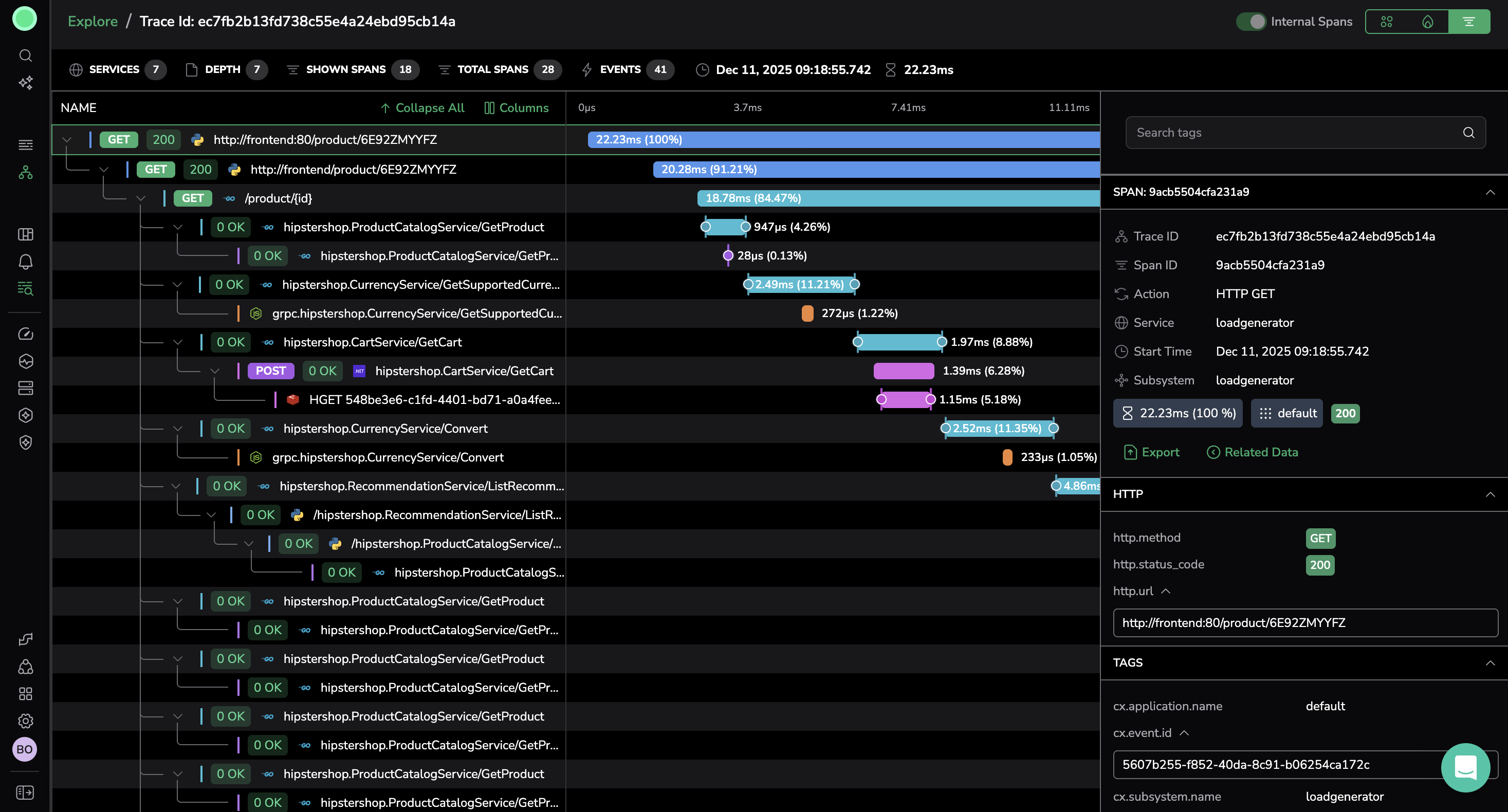 - Click on a span/trace of interest, for example in your Explore Screen, to view its underlying spans.