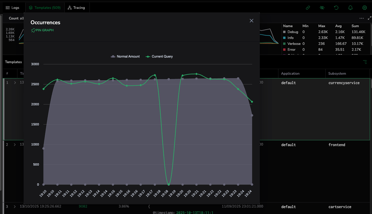 As you can see below, we went from 1.7k entries to only 14 templates. There is also a display of how many times each pattern arrived, the ratio of each pattern, and a full visualization of all parameters. This serves as a major timesaver in terms of log analysis.