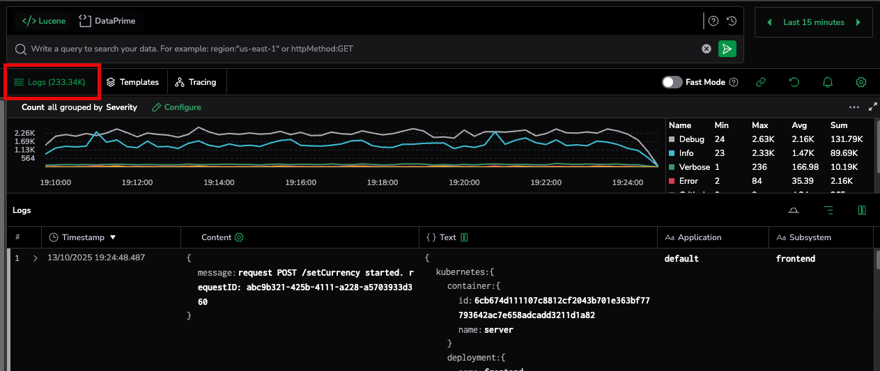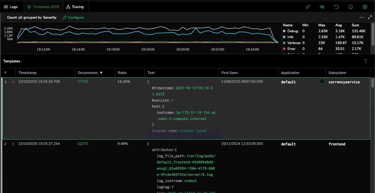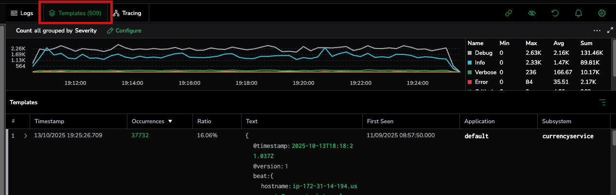 2) Within seconds of clicking Templates, the 1.7k logs become grouped into their original patterns, thereby dramatically reducing the number of entries into 14 templates.