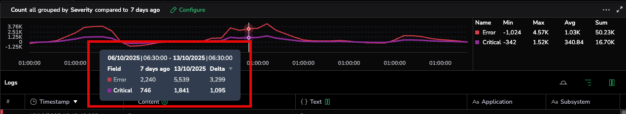 - At the chosen mark, you can view the number of Error as 5,539 and Critical as 1,841. To compare this with last week,