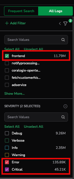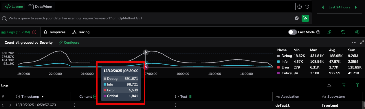 - We are interested in analyzing logs with Error and Critical priority for the frontend subsystem for the last 24 hours: