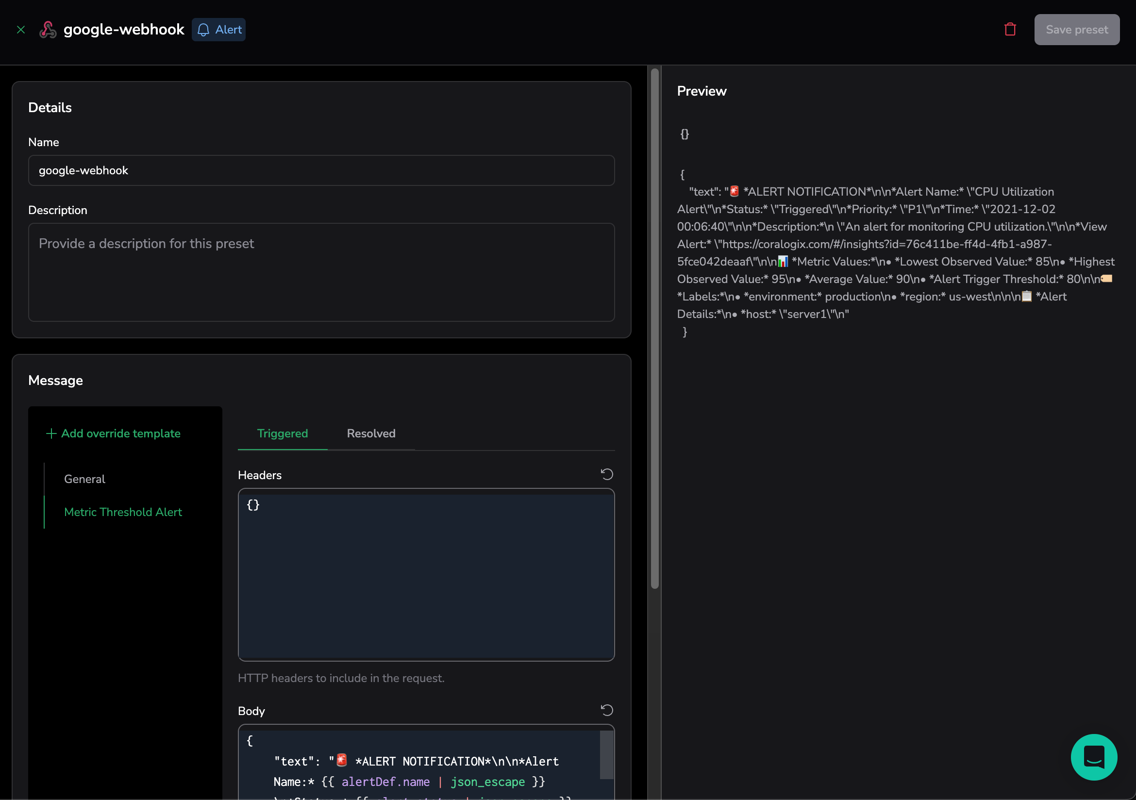 Outbound notifications are sent to a destination type using a preset, a message configuration of templates with conditions that are rendered with data from an event to produce the final notification context.