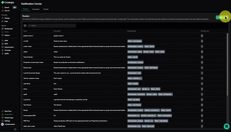 - Select Integrations, then Notification Center and Routers. The Routers list displays all existing routers.