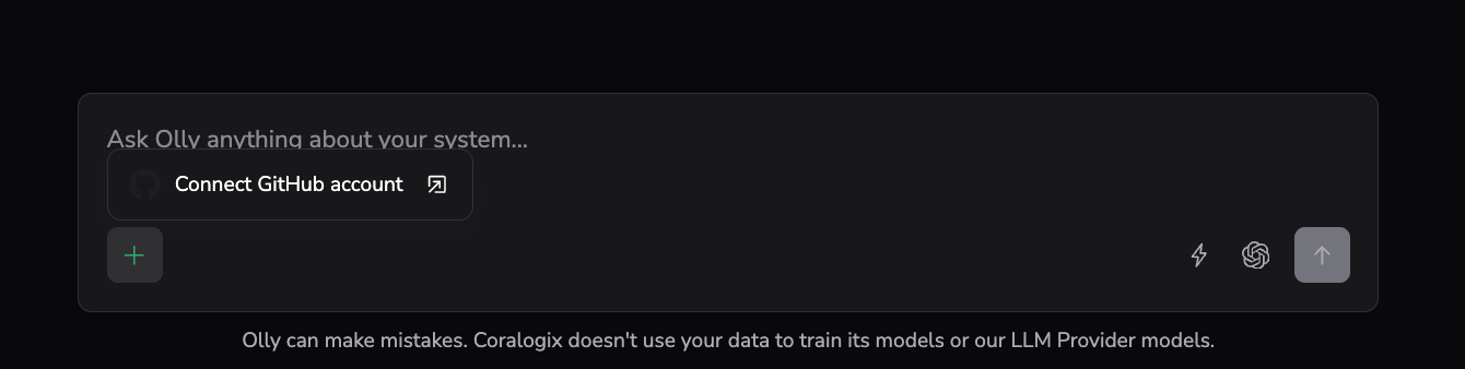 - In the Olly chat, select the + icon in the chat input, then select Connect GitHub account.
