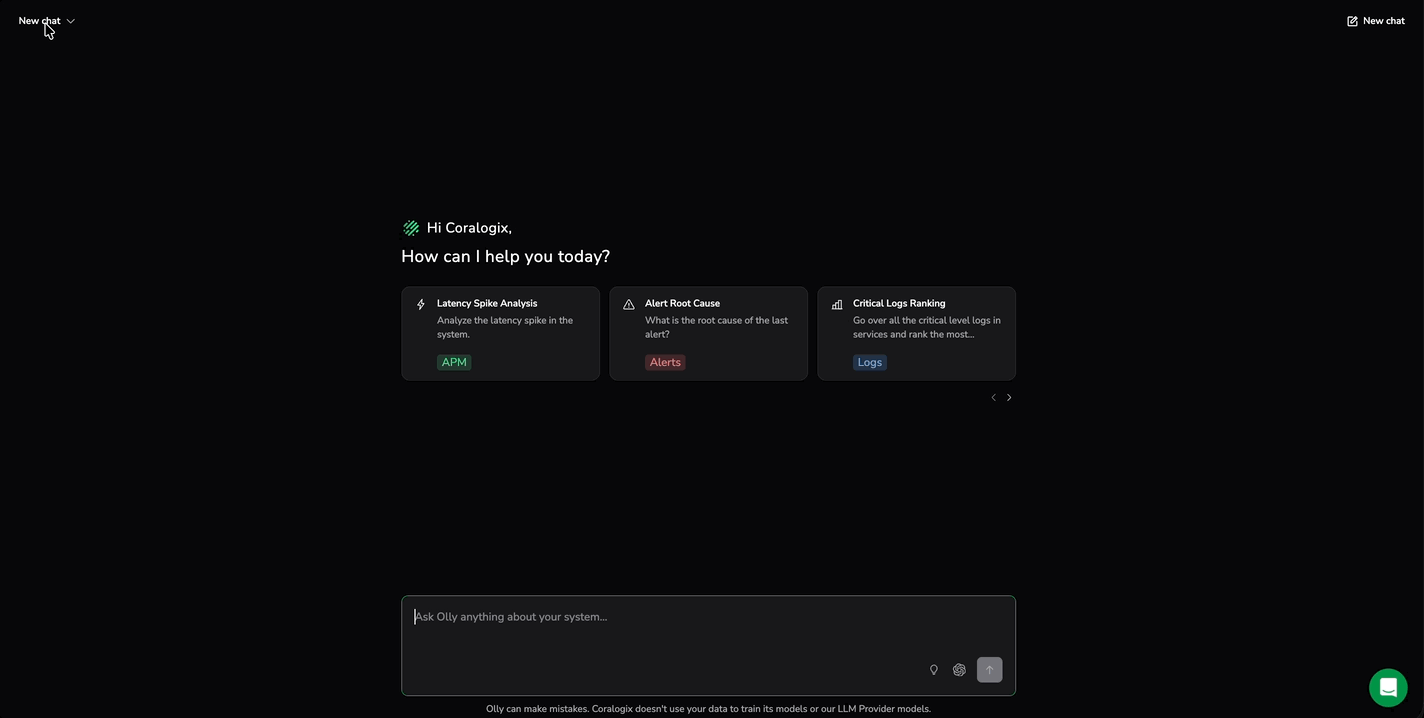 The Olly chat is your primary interface for interacting with Olly. Ask questions in natural language, browse prompt templates, and explore structured artifacts — all within a single conversation view.