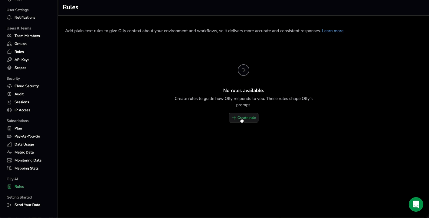 User rules allow you to customize how Olly responds to you by defining personal preferences in plain text. These rules give Olly additional context about your environment, workflows, and response style, so it can better align with how you work and deliver more accurate, consistent insights across sessions.