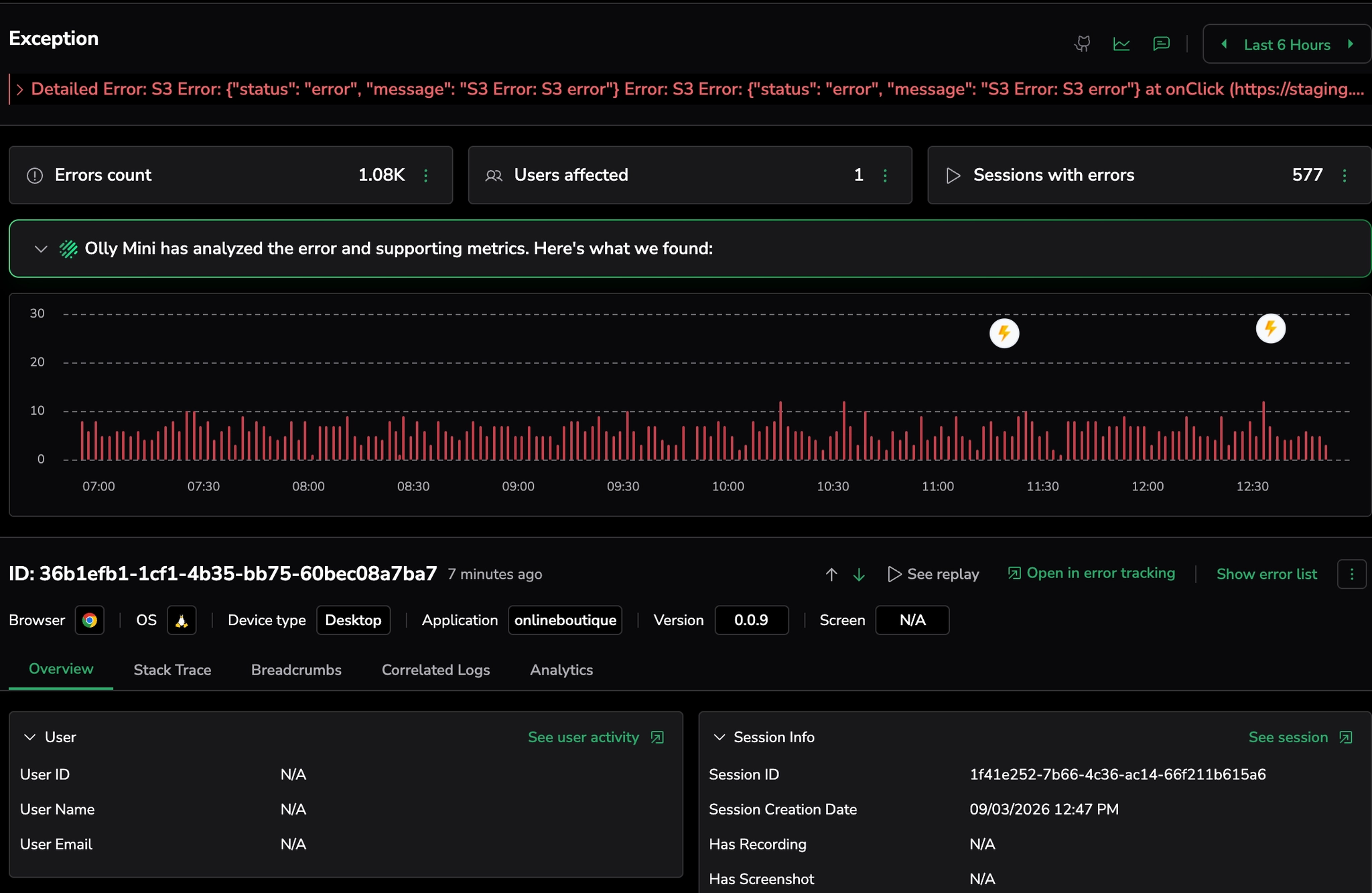 Use Olly Mini in RUM Error Tracking to quickly understand errors and identify next debugging steps.