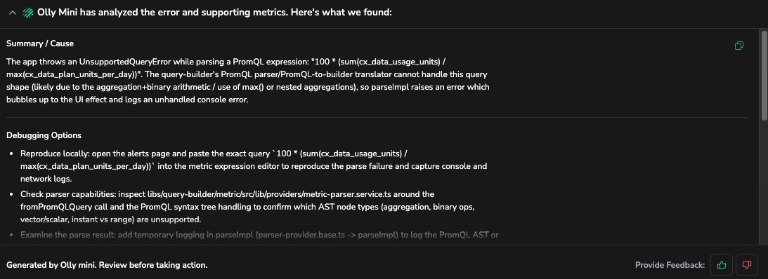 Olly Mini analyzes an error and provides a structured explanation of the likely cause, along with investigation guidance.