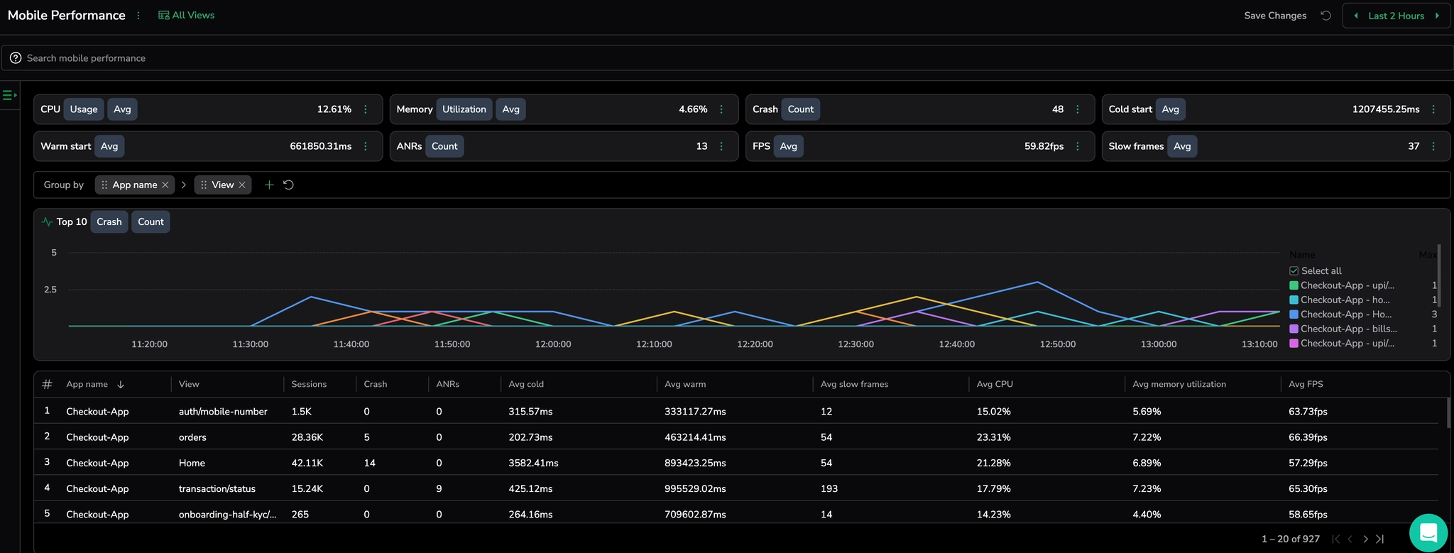 - Data table: Break down performance metrics by mobile attributes, such as application and views, to identify which screens contribute most to poor user experience.