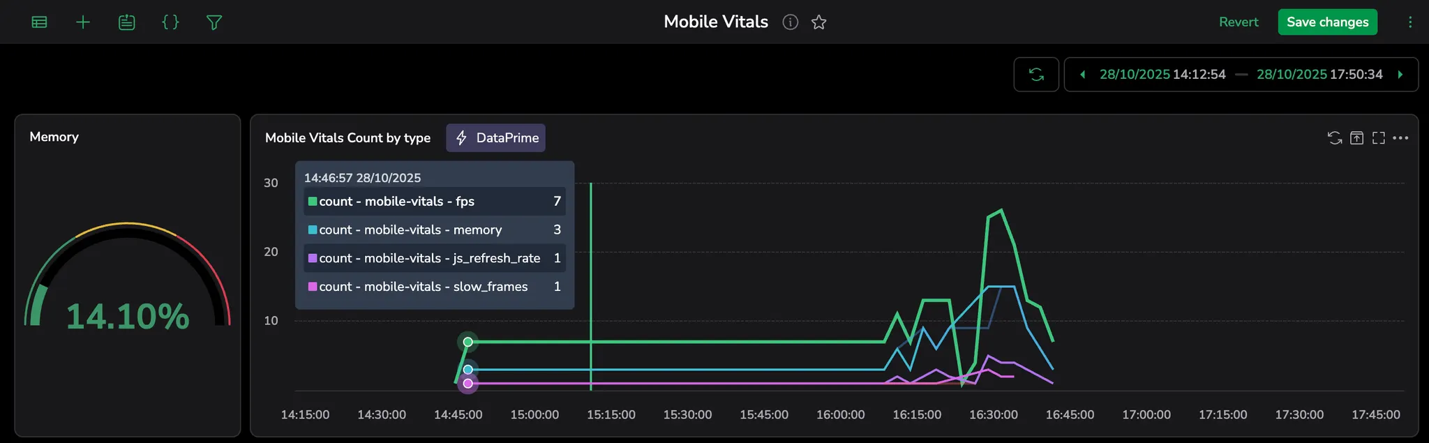 - Android and iOS: Individual Mobile Vital metrics (CPU, memory, FPS, start times, FPS) can be enabled or disabled in the SDK configuration. See SDK installation guides for more details: