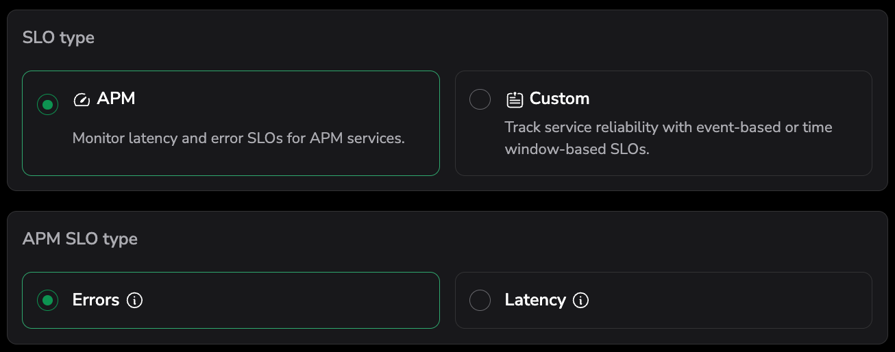 APM SLOs provide a simplified, service-focused way to define reliability objectives for your applications. Instead of building custom queries, you choose whether to track Errors or Latency, and Coralogix applies standardized metrics and calculations behind the scenes.